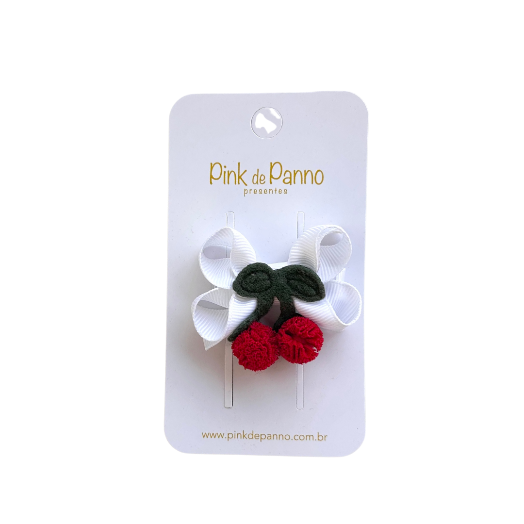 Modelo boutique com aplique de cereja delicada em pompom. No bico de pato todo emcapado, o laço cereja possui antideslizante para não escorregar do cabelo.